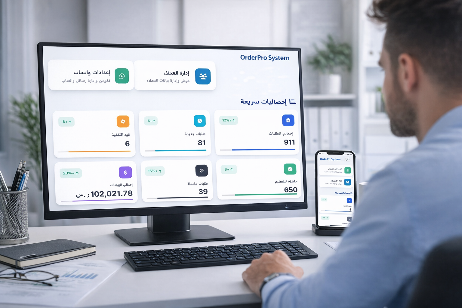 كل ما تحتاجه لإدارة الطلبات باحترافية… مع إشعارات واتساب وفوترة إلكترونية.